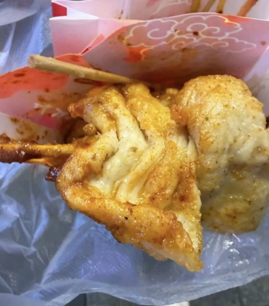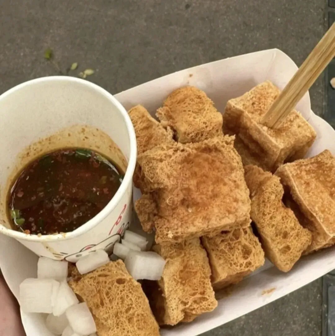继续往前,臭名远扬臭豆腐,外面炸到酥脆入口即化的口感,里面是那种还能流心的嫩豆腐。感觉外面炸得太过了,吃起来很油。白萝卜丁可以解腻,蘸水是有点辣的,总的说还是太油了。