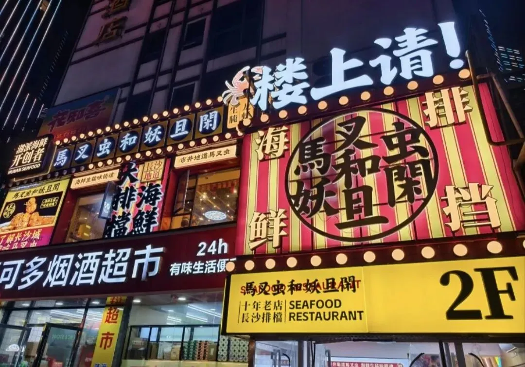 我们晚餐去了一家叫做:马叉虫和妖且闲大排档(就在五一广场太平街口),小红薯种草的。没踩雷都是本地人来吃!饭点座无虚席,超多回头客。开了好多年的口碑海鲜大排档,好好吃啊海鲜面、烤芝士粒、鳗鱼卷、海兔子,都是其他店吃不到的!!用料实在,一吃一个不吱声!!!招牌菜可以盲点,不踩雷!招牌罗氏虾又大只又嫩,好入味!!红酒蓝莓鹅肝、泰式三文鱼、香辣蟹、生腌,老板对菜品很有自己的研究,相信我一定不会失望!!!
