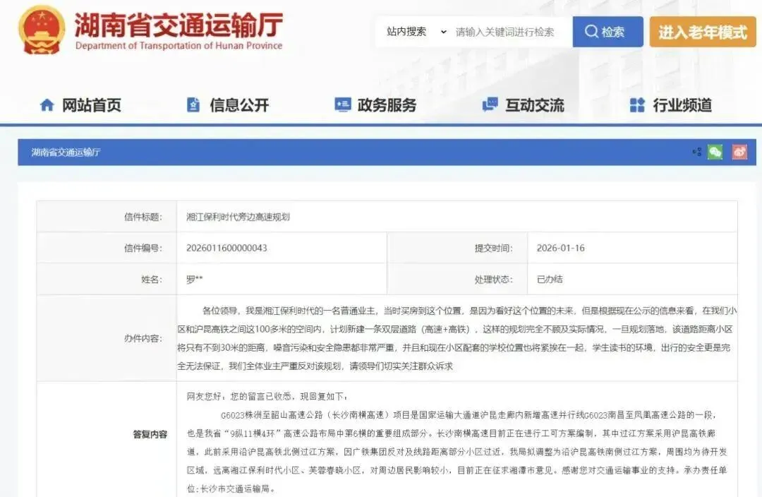 先看看省交通厅的回复:“长沙南横高速目前正在进行工可方案编制,其中过江方案采用沪昆高铁廊道,此前采用沿沪昆高铁北侧过江方案,因广铁集团反对及线路距离部分小区过近,我局拟调整为沿沪昆高铁南侧过江方案”。