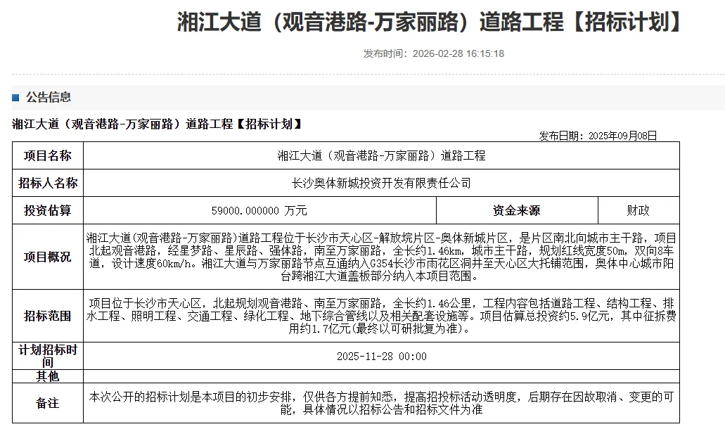 近日,长沙公共资源交易中心发布湘江大道(观音港路-万家丽路)道路工程【招标计划】。