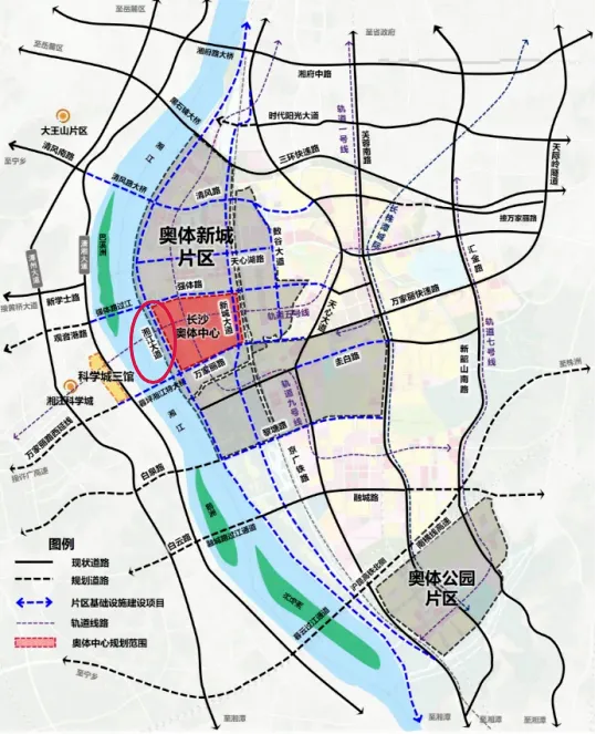 根据规划,奥体新城片区已形成“六纵六横”路网体系,奥体大道、湘江大道等主干道即将开工,地铁5号线南延线、7号线南延线也在规划中,交通节点逐步成型。
