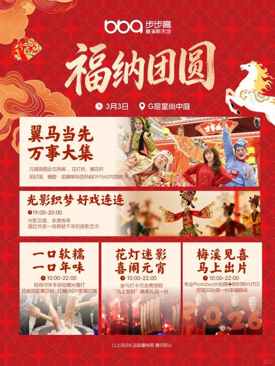 步步高梅溪新天地元宵狂欢来啦!3月3日,G层星尚中庭一站式玩转非遗:手作集市体验民俗DIY,晚上7点观赏皮影戏,亲手锤捣糯米糍粑,参与花灯迷影活动还能领取限定好礼。更有专业Photobooth拍摄+即时打印,定格幸福瞬间。