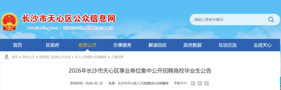 根据《事业单位人事管理条例》等有关规定,结合我区工作需要,经研究,决定面向高校毕业生集中公开招聘事业单位工作人员10名。2026年2月27日—3月4日报考人员通过天心区人社局招考网站进行报名,3月5日—3月6日报考人员进行缴费,3月中下旬举行笔试。现将有关事项公布如下: