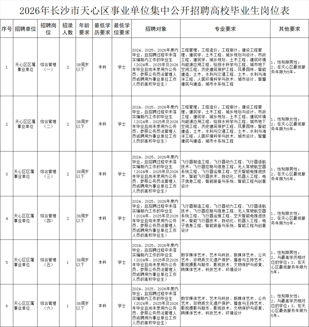 此次招聘岗位6个,招聘计划10名。详见《2026年长沙市天心区事业单位集中公开招聘高校毕业生岗位表》(附件1)。