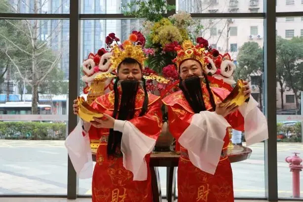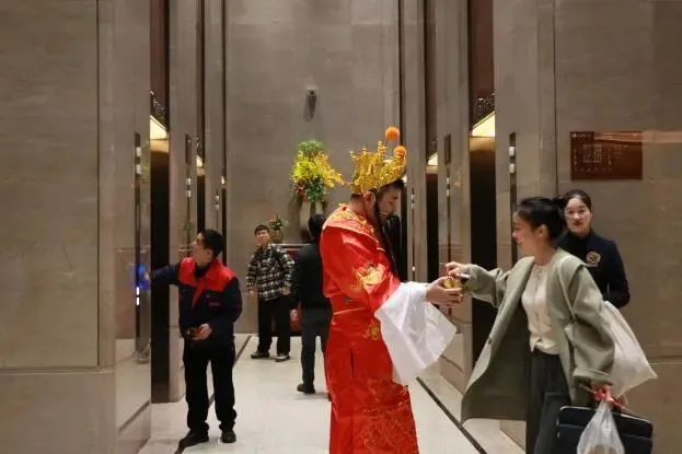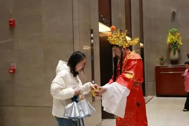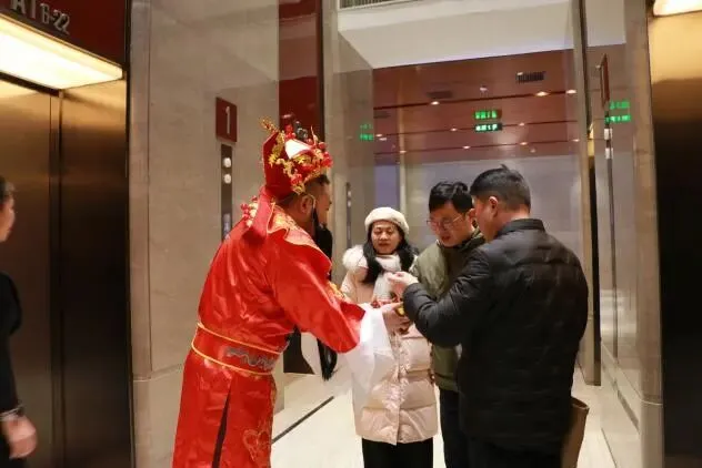 当日清晨,写字楼内张灯结彩,年味浓郁。身着红袍、头戴金冠的“财神爷”们手持金元宝与新春福袋,一亮相便成为现场焦点。“财神爷”每到一处,都向业主们拱手道贺,送上“开工大吉”“财源广进”的美好祝福,同时将寓意吉祥的金元宝摆件、福袋分送到业主手中。“一大早看到财神爷,太惊喜了!这不仅是讨个好彩头,更让我们感受到了物业的用心。”业主们接过福袋,喜悦之情溢于言表。
