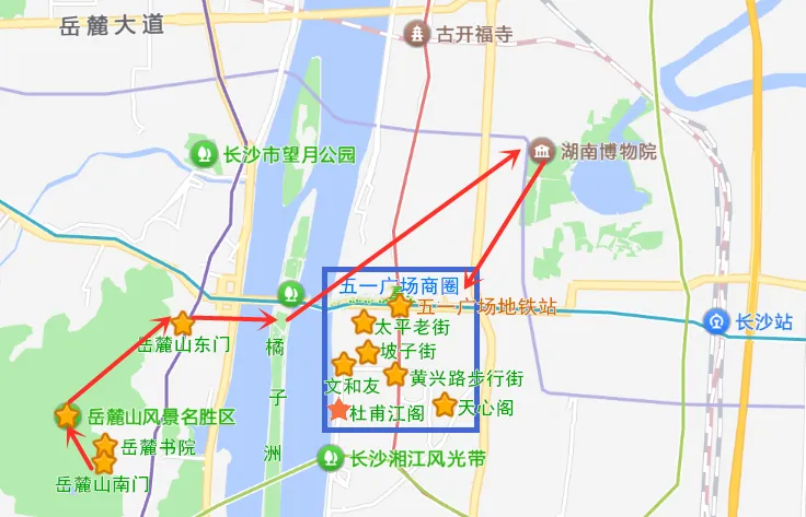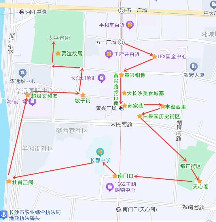 (1)五一广场商圈游玩路线可参考下图,建议适当省略掉一些景点,比都正街区、天心阁、杜甫江阁位置有点偏远,可以省略。不过杜甫江阁和天心阁夜景很不错,喜欢古建筑夜景的,建议去看看。