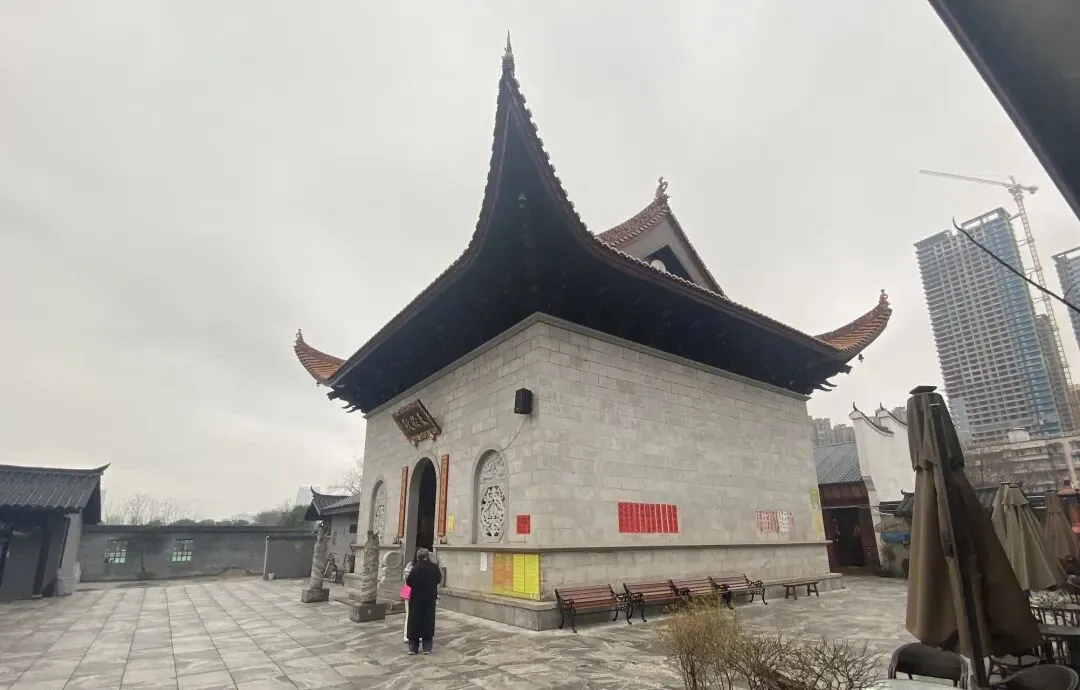 没有阳光,但那种灰蒙蒙的天色反倒让古殿的轮廓更清晰,像一幅淡墨的画。旁边几棵老树,枝丫光秃秃的,伸向天空。那一瞬间真有点恍惚,长沙闹市区,居然藏着一个一千三百年前的道观。