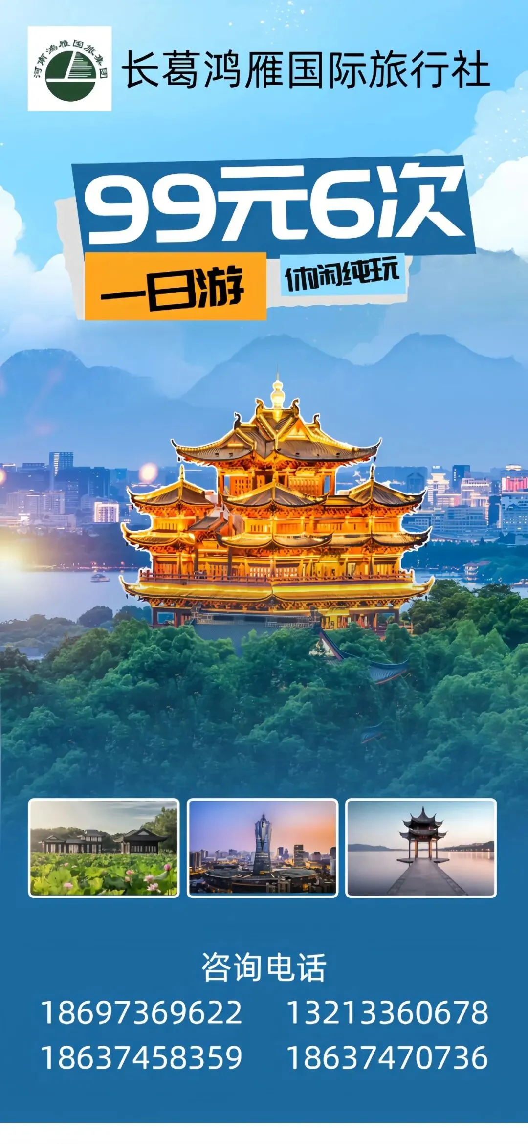 为了您的合法权益,请报名时查看资质证书、营业执照。河南鸿雁国际旅行社旅游经营许可证编号:L-HEN-CJ00054