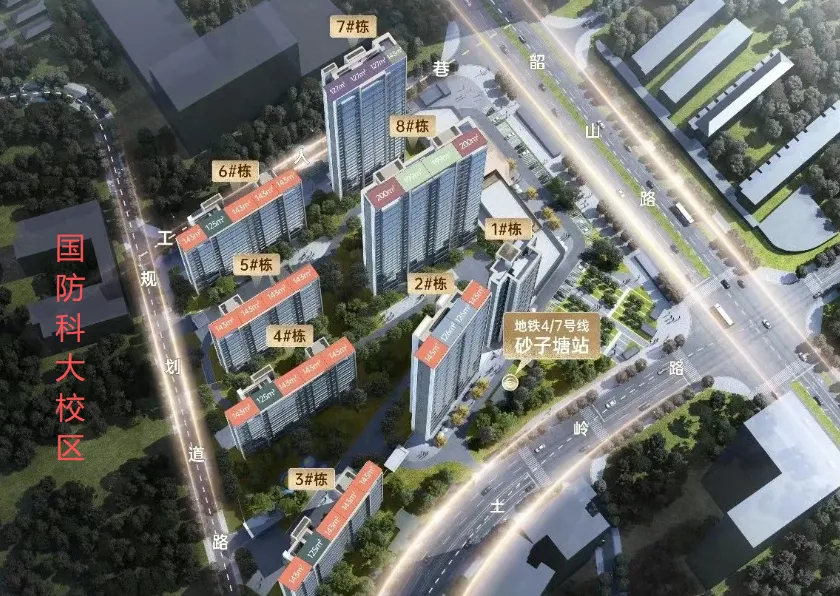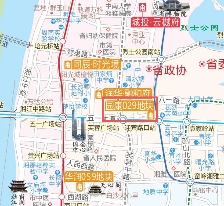 项目占位雨花中心城区,属东塘地块,楼下就是地铁4号线和7号线(在建)换乘站砂子塘站,小区地库将与地铁站无缝接驳,北面紧挨长沙市工人文化宫,西边是国防科技大学社科院,东边与湖南中医药大学第一附属医院一路之隔。
