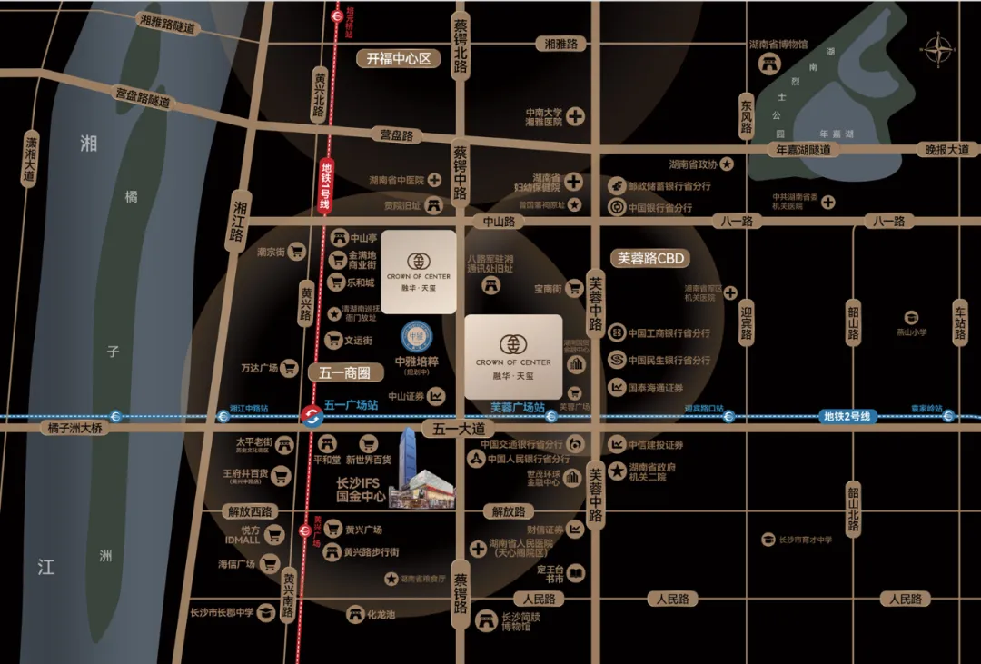 项目占位开福中心城区,芙蓉路以东、开福寺路以南、东风路以西、潘家坪路以北,芙蓉中路CBD,紧邻超20万方富兴时代广场,穿过富兴便是地铁6号线湘雅医院站。