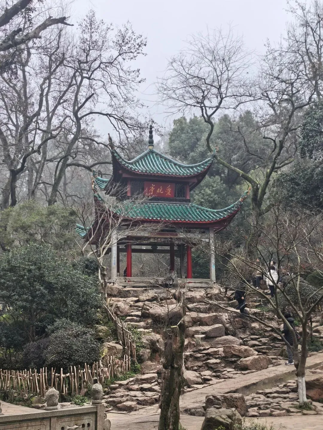 从湖大出来,我们就直奔岳麓山。首先来到爱晚亭,作为中国四大名亭之一,它因杜牧的诗句“停车坐爱枫林晚,霜叶红于二月花”闻名天下,又因毛主席的题词更添风骨。冬日的爱晚亭,少了秋日红叶似火的绚烂,却多了几分古朴清幽。因为人不少,我们没有挤到近处,只是在远处静静看了看,拍了几张照片。红檐古亭藏在林木间,古朴又雅致,光是远远望着,就能感受到它的名气和韵味。对我而言,这样不慌不忙、远远欣赏,反而比挤在人群里更舒心。