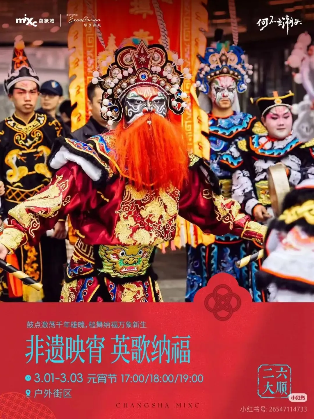 长沙万象城元宵节压轴上演潮汕非遗英歌舞,可在万象城户外街区近距离感受英歌巡游与擂鼓震天的炸场魅力,体验传统民俗的现代活力,过一个热血沸腾的元宵佳节!