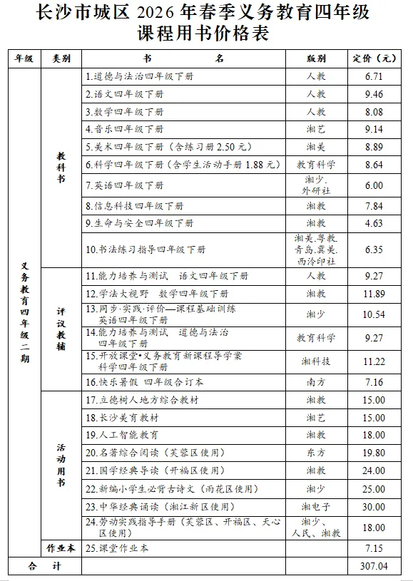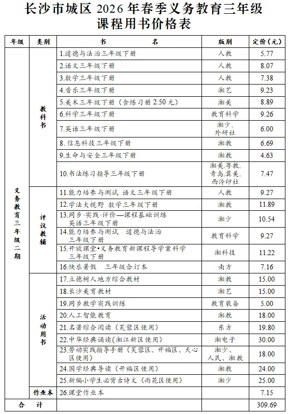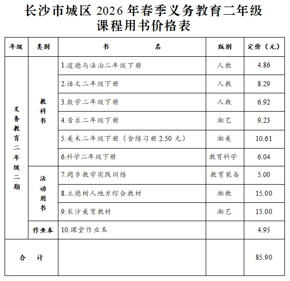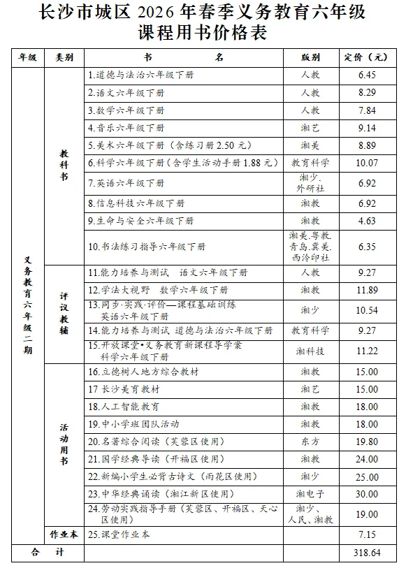 根据《湖南省发展和改革委员会 湖南省新闻出版局 湖南省教育厅 湖南省市场监督管理局关于印发<湖南省中小学教材价格管理办法>的通知》(湘发改价费规〔2022〕307号)、《湖南省发展和改革委员会 湖南省财政厅 湖南省教育厅 湖南省市场监督管理局关于进一步明确我省中小学教育收费政策的通知》(湘发改价费规〔2022〕643号)、《湖南省发展和改革委员会 湖南省教育厅 湖南省市场监督管理局关于印发<湖南省民办中小学收费管理办法>的通知》(湘发改价费规〔2024〕307号)、《湖南省发展和改革委员会 湖南省新闻出版局 湖南省教育厅关于核定湖南省中小学教辅材料价格的通知》(湘发改价费〔2025〕23号)、《湖南省发展和改革委员会 湖南省新闻出版局关于核定湖南省2026年春季中小学教科书价格的通知》(湘发改价费〔2026〕75号)等文件精神,结合我市实际,现就2026年春季普通中小学和中等职业学校收费标准及有关事项通知如下: