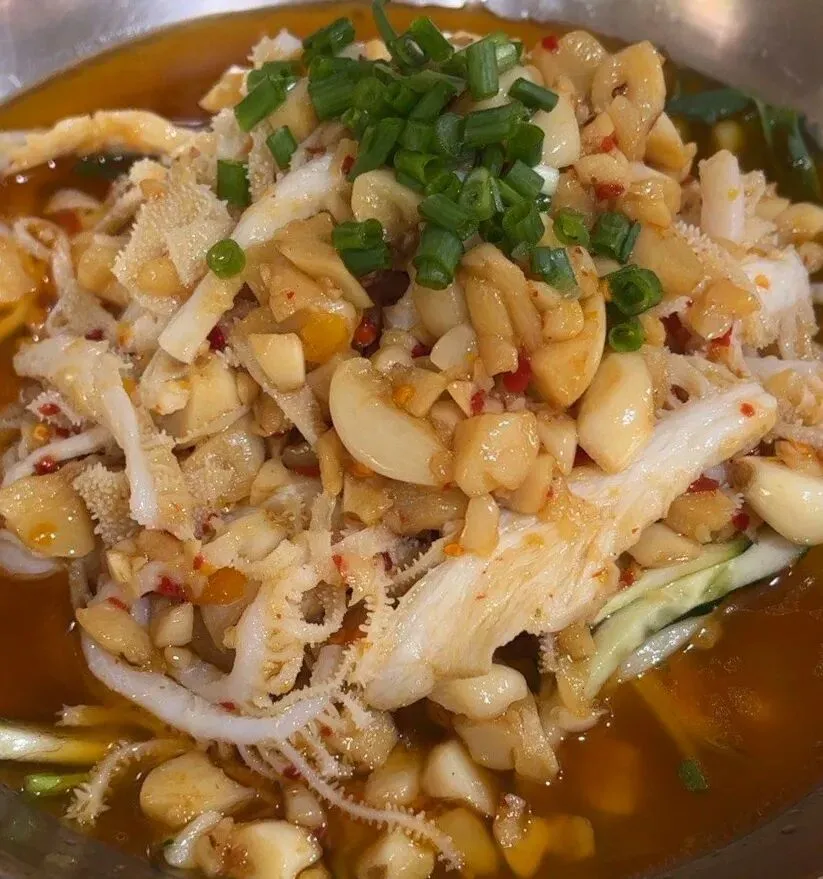 桑拿牛肉,招牌菜之一,切好的新鲜牛肉和骨头汤一起上桌,自己涮着吃,牛肉很嫩,蘸不蘸酱汁都好吃。鸭掌筋,个人感觉中规中矩的,还行吧,但是还蛮喜欢它不是那种特别辣的,加了榨菜也丰富了口感,比较巧妙。蒜香牛百叶,平时在外面吃酸萝卜牛百叶比较多,这个不一样的做法还挺不错的,大蒜子干辣椒的香,还有一点点山胡椒油味,牛百叶入味,底部垫的黄瓜丝也清爽……酸菜汤圆,个人本身就觉得炒汤圆好吃,他家这个汤圆煎得外壳脆脆的且不显得很油,里面软糯香甜,加点这种脆脆的酸菜,咸甜搭配,从口感到味道都比较丰富好吃。