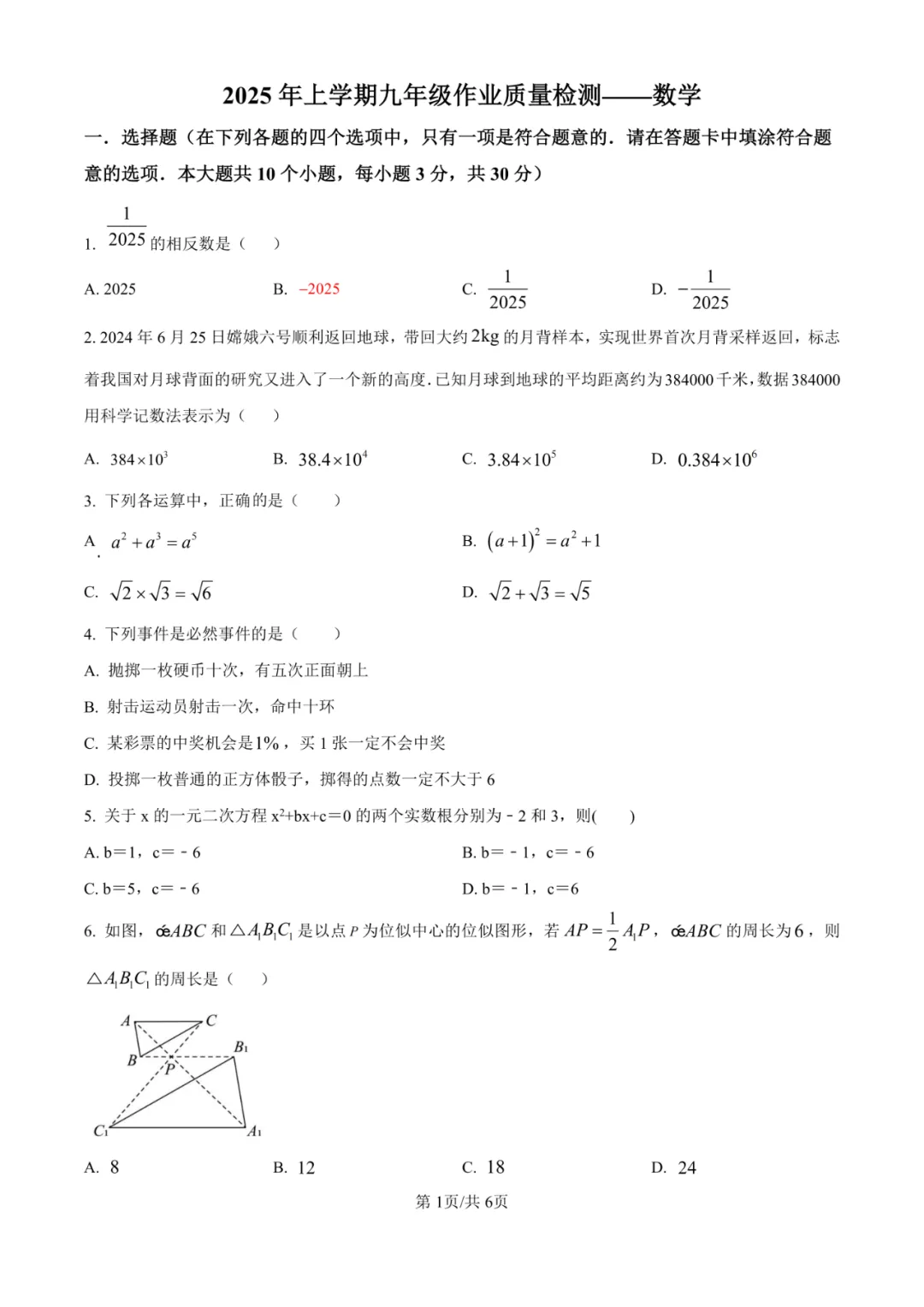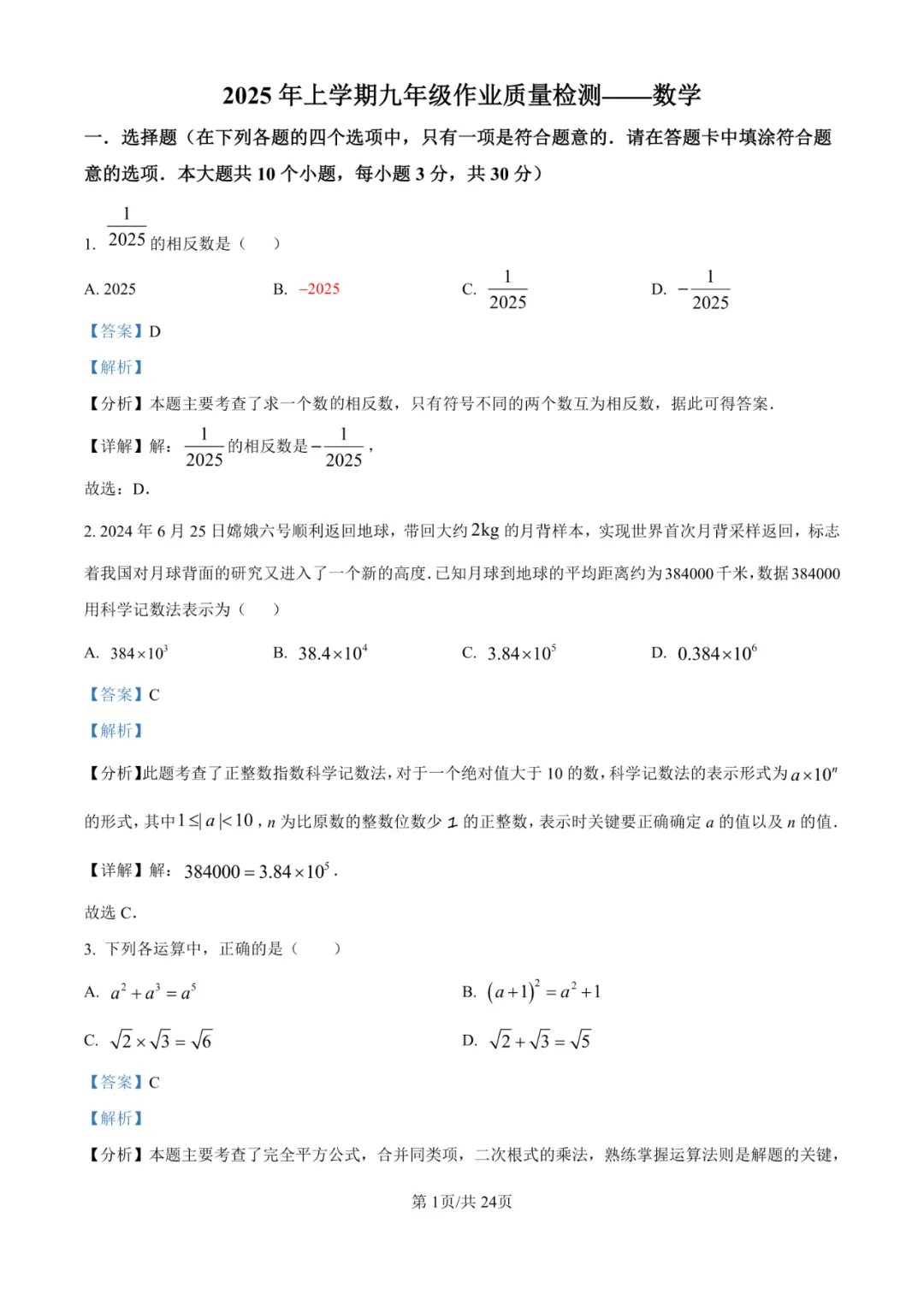 试卷严格对标九年级数学课标,全面考察实数运算、科学记数法、一元二次方程根与系数关系、统计概念、几何变换、圆的性质及二次函数与几何综合等核心内容。选择题1-4、填空题11-13等对基础概念的考察是主要得分点。难点高度集中于第10题(逻辑推理与分类讨论)、第24(2)(3)题(二次函数与角平分线、新定义条件下的点存在性探究)以及第25(2)(3)题(圆与相似、面积的综合探究),这些题目对学生的逻辑推理、模型构建与多知识点综合应用能力提出了极高的要求。