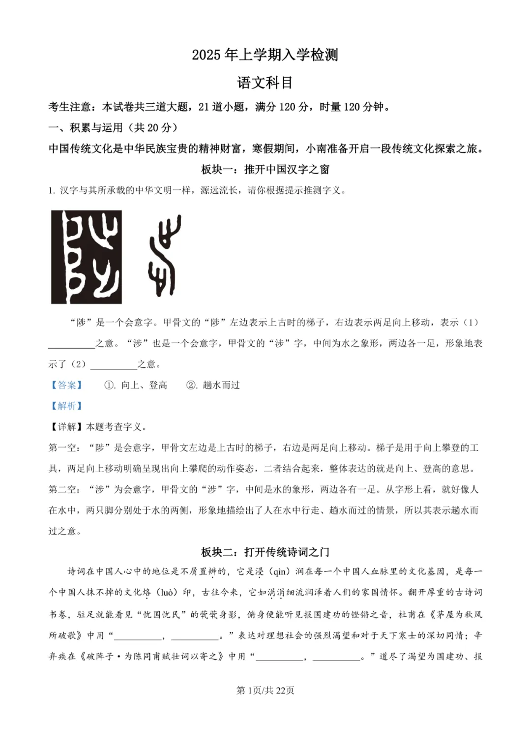 试卷紧扣九年级语文核心素养,以“传统文化探索之旅”为主线,全面考察了汉字字源、古诗文理解默写、名著阅读、非连续文本阅读、文学作品赏析(古诗词、文言文、小说)及情境写作。基础题如古诗文名句默写是主要得分点。难点高度集中于古诗鉴赏手法与情感深度分析、文言文断句与实词辨析、小说主题与人物关系的深层理解,以及非连续性文本信息的整合与迁移应用,这些题目对学生的逻辑思维、审美品味和文化底蕴有极高要求。