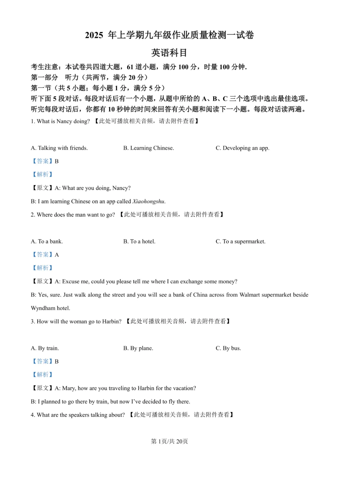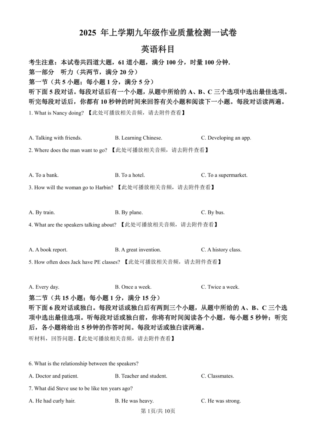 试卷紧扣九年级课标,核心考察听力、阅读理解、语言运用(完形、语法、词汇)、读写结合与书面表达。听力、阅读理解A篇(调查报告)及部分基础完形题为易得分点。难点在于长篇阅读理解(C、D篇)的逻辑推理与细节辨析、语篇补全的逻辑构建、完形填空的语境深度理解与文化背景知识(如阿斯克勒庇俄斯之杖)以及作文中对AI利弊的辩证分析与论述,对学生的思维深度与综合语言输出能力提出了高要求。