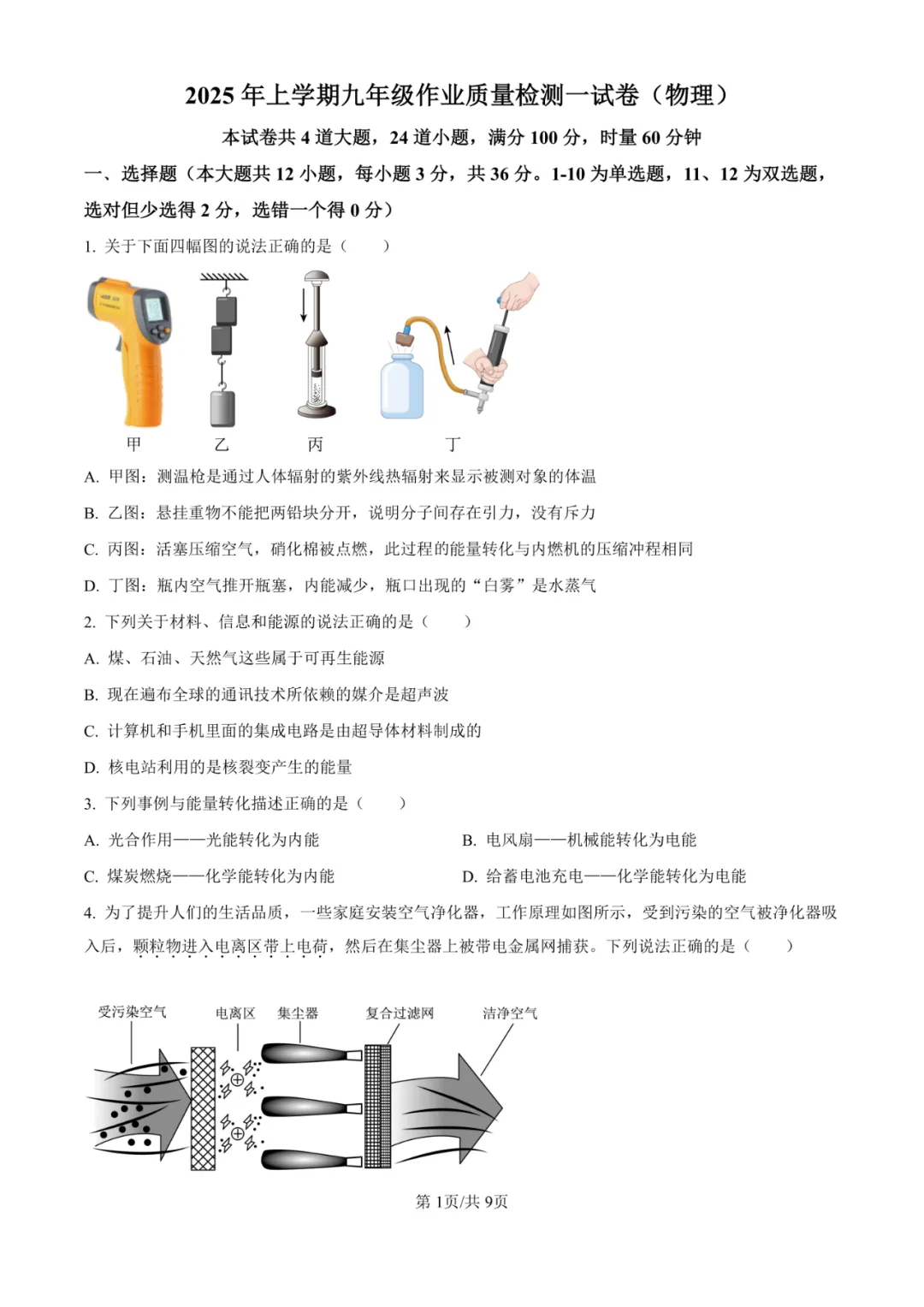 试卷全面考察了内能与热机、电与磁、电路与欧姆定律、电功与电功率、安全用电、能量转化与守恒等九年级物理核心主干知识。选择题前6题、填空题13-15等基础概念题为易得分点。难点在于第17题(基于图像分析复杂动态电路)、第22(4)题(探究实验的方案调整与误差控制)以及第24(3)题(在限定条件下求替换电源电压范围),这些题目需要学生深刻理解物理规律,具备扎实的数学运算、逻辑推理和解决复杂问题的能力。