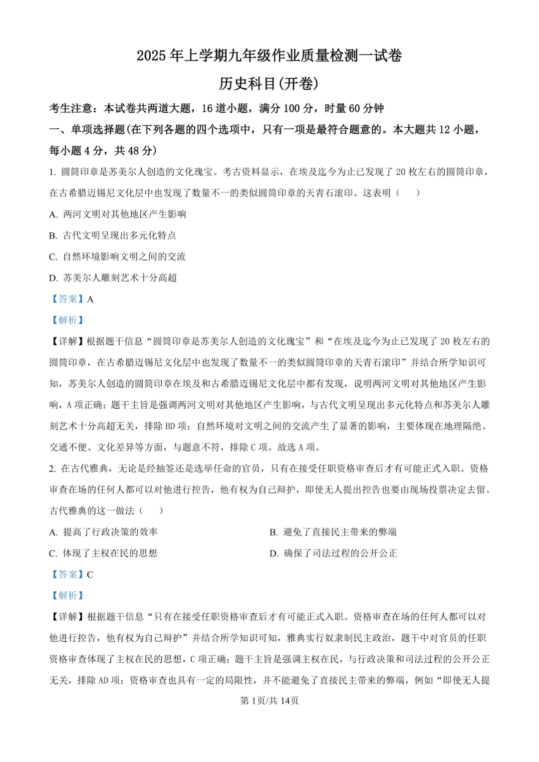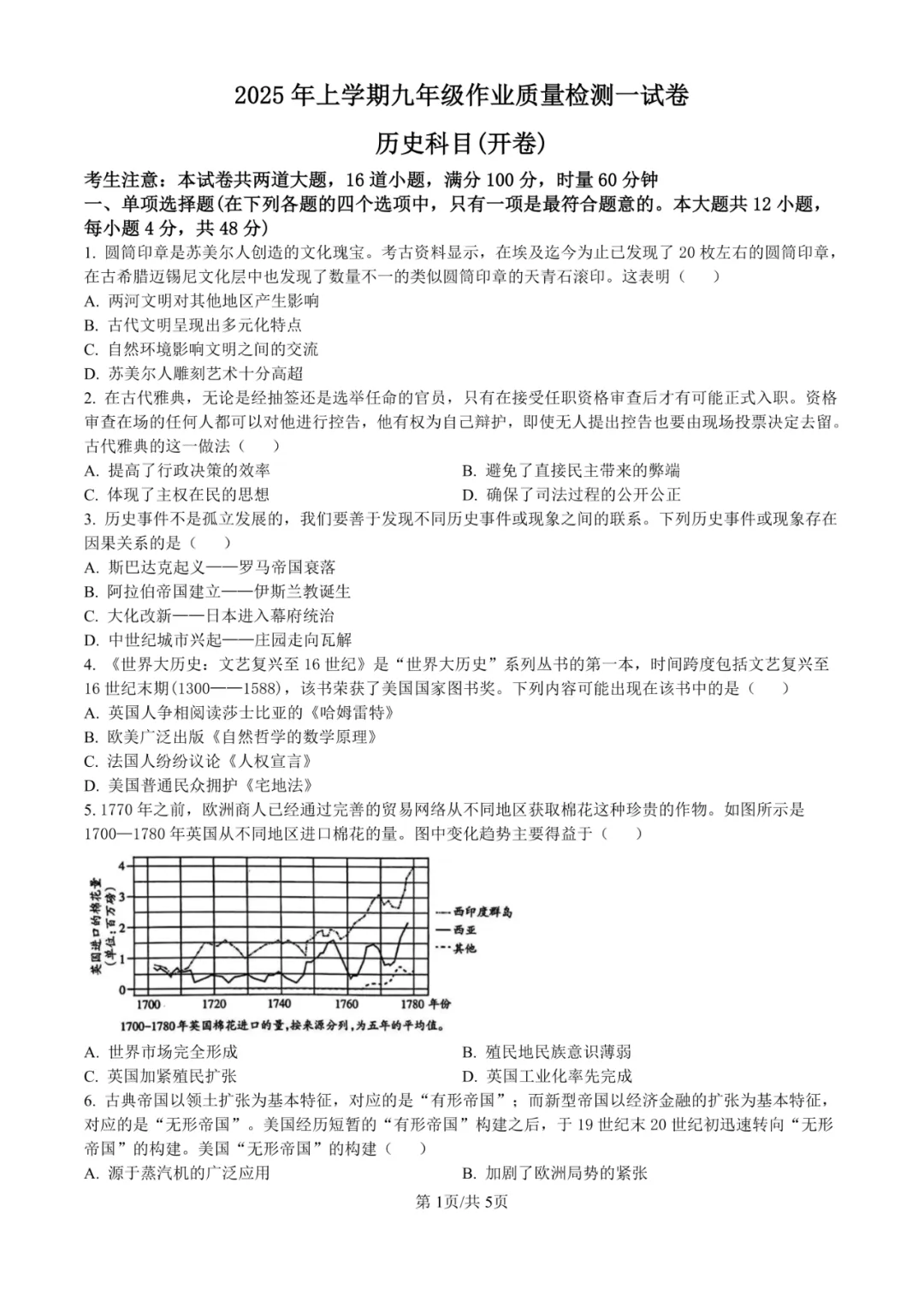 试卷严格对标九年级世界史课标,核心考察古代文明、雅典民主、思想解放运动、工业革命、殖民扩张、社会主义运动、大国崛起、两次世界大战、冷战、全球化与当代国际冲突等核心内容。选择题1-6、9-12等对基础史实与概念的直接判断是主要得分点。难点高度集中于第13题(“危机推动转型”观点论述)、第15(3)题(比较俄国与日本改革结果差异)及第16(3)题(解读20世纪40年代美国海报,围绕“经验教训”展开说明),这些题目要求学生具备扎实的史实基础、极强的信息整合、跨时空比较、逻辑论证与历史解释能力。