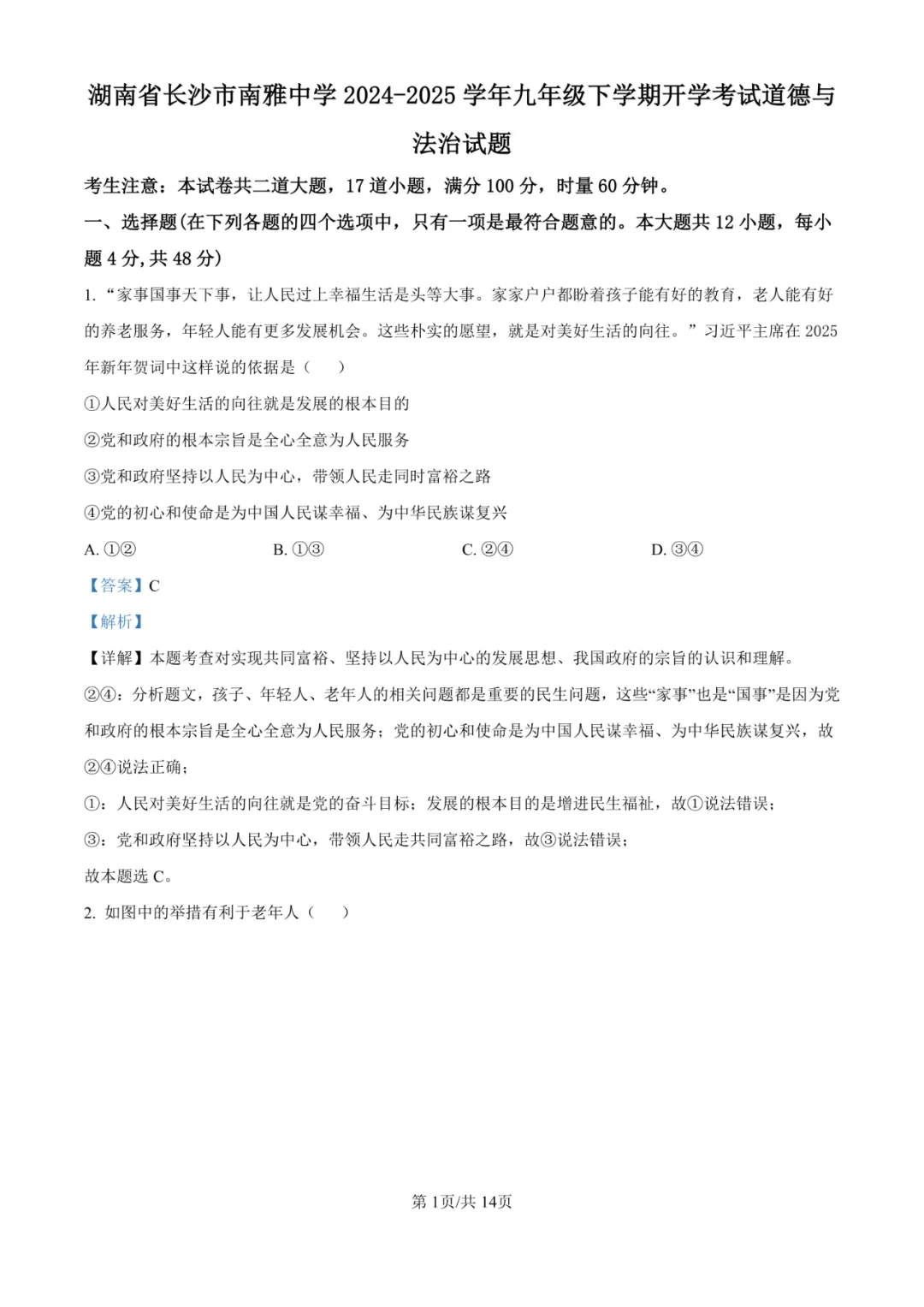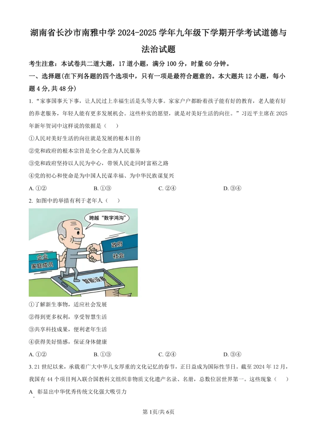 试卷紧扣九年级下册“民主与法治”、“富强与创新”、“文明与家园”、“和谐与梦想”等核心单元,全面考察了以人民为中心的发展思想、科教兴国、文化自信、全过程人民民主、一国两制、人类命运共同体、生态文明建设、新质生产力、健康中国等核心议题。选择题(如第1、3、5、9题)对基本概念与时政背景的直接辨析是主要得分点。难点高度集中于第13题(全过程人民民主的系统认识)、第15题(《能源法》出台的必要性多维度分析)、第16(2)题(解决现实问题的系统性建议)以及第17(1)(2)题(图文信息整合与情境化自我推荐),这些题目对学生的信息整合、逻辑论证、价值判断与迁移应用能力提出了极高要求。
