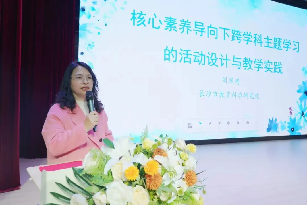 随后,长沙市教育科学研究院课程发展中心主任刘翠鸿带来《核心素养导向下跨学科主题学习的活动设计与教学实践》专题讲座。刘老师结合深厚理论与丰富实践,从设计原则到评价方法,有效破解了老师们在跨学科教学中的困惑与难题。为老师们提供了前沿而专业的引领。