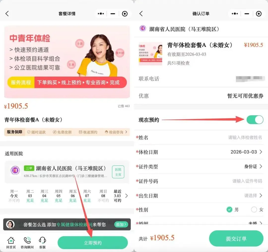 点击相应套餐右下角的【立即购买】,勾选【现在预约】按钮,填写体检人信息、体检日期等,立即支付,即可完成预约。