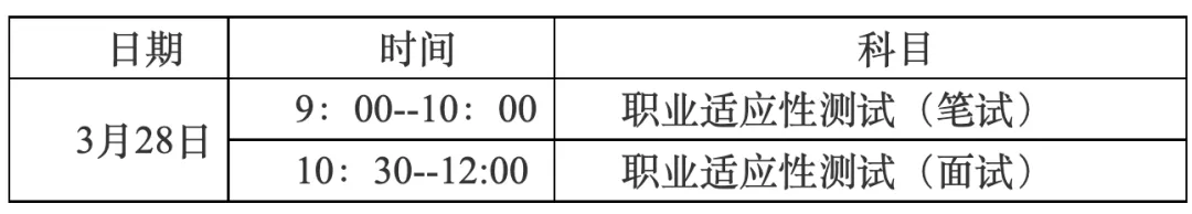 2.职业适应性测试由我校负责命题与组考,考试形式为笔试+面试,总分200分,笔试、面试各100分,主要考核学生的语言表达、创新思维、反应能力、知识面等基本素质。