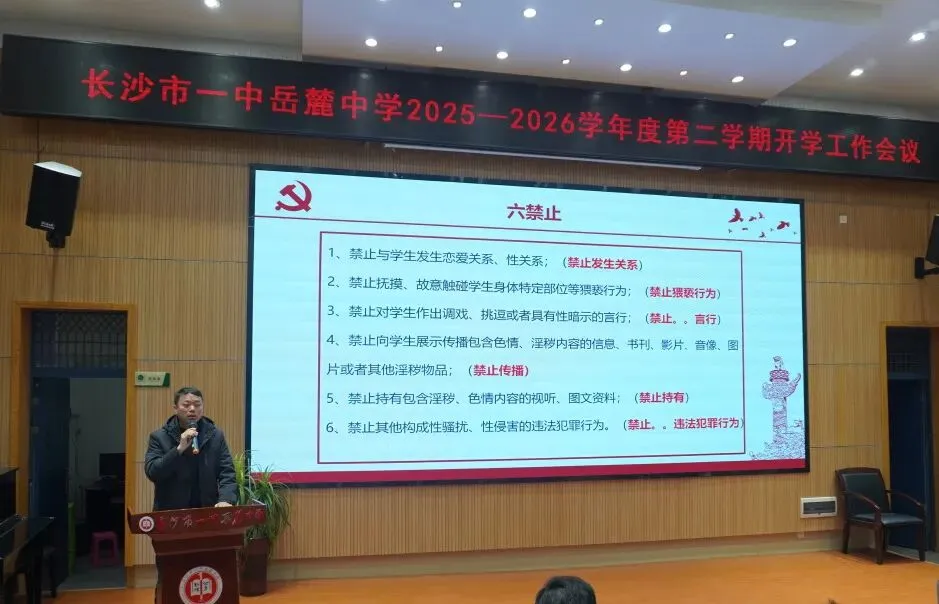 东风拂面,春意渐浓。2026年3月2日上午,长沙市一中岳麓中学全体教师以饱满的精神状态齐聚第二教学楼一楼多媒体教室,参加2025-2026学年度第二学期开学工作会议,共同擘画新学期发展蓝图。会议由督导室主任刘泽红主持。