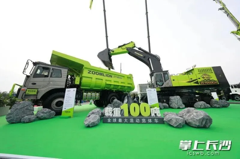 其中,全球最大混合动力矿用宽体自卸车ZT160HEV霸气矗立,这款“巨无霸”额定载重100吨,搭载中联重科自研的ZM-i混联混动系统,创下“载重最大、能效最优、制动最稳”三项行业之最;混合动力矿用挖掘机ZE1050G采用新一代电液混动系统架构,搭载新型智能能量管理系统,其电池、电机、电控采用高效智能热管理系统,配合自适应温控策略,轻松应对各种严苛工况。
