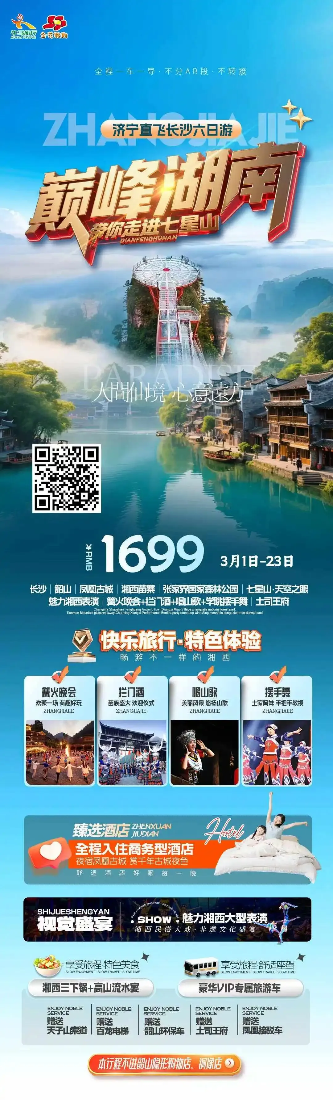 1699元/人 湖南双飞6日游:长沙/橘子洲/韶山/凤凰古城/苗寨/张家界森林公园/七星山.天空之眼/魅力湘西表演/篝火晚会/土司王府