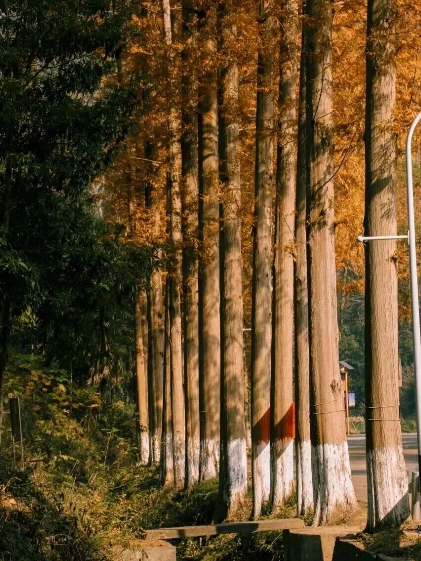 红黄色水杉林织成「森林剧场」,阳光穿透枝叶洒下光斑,随手拍都是森系大片。