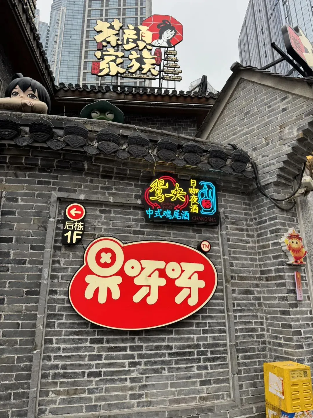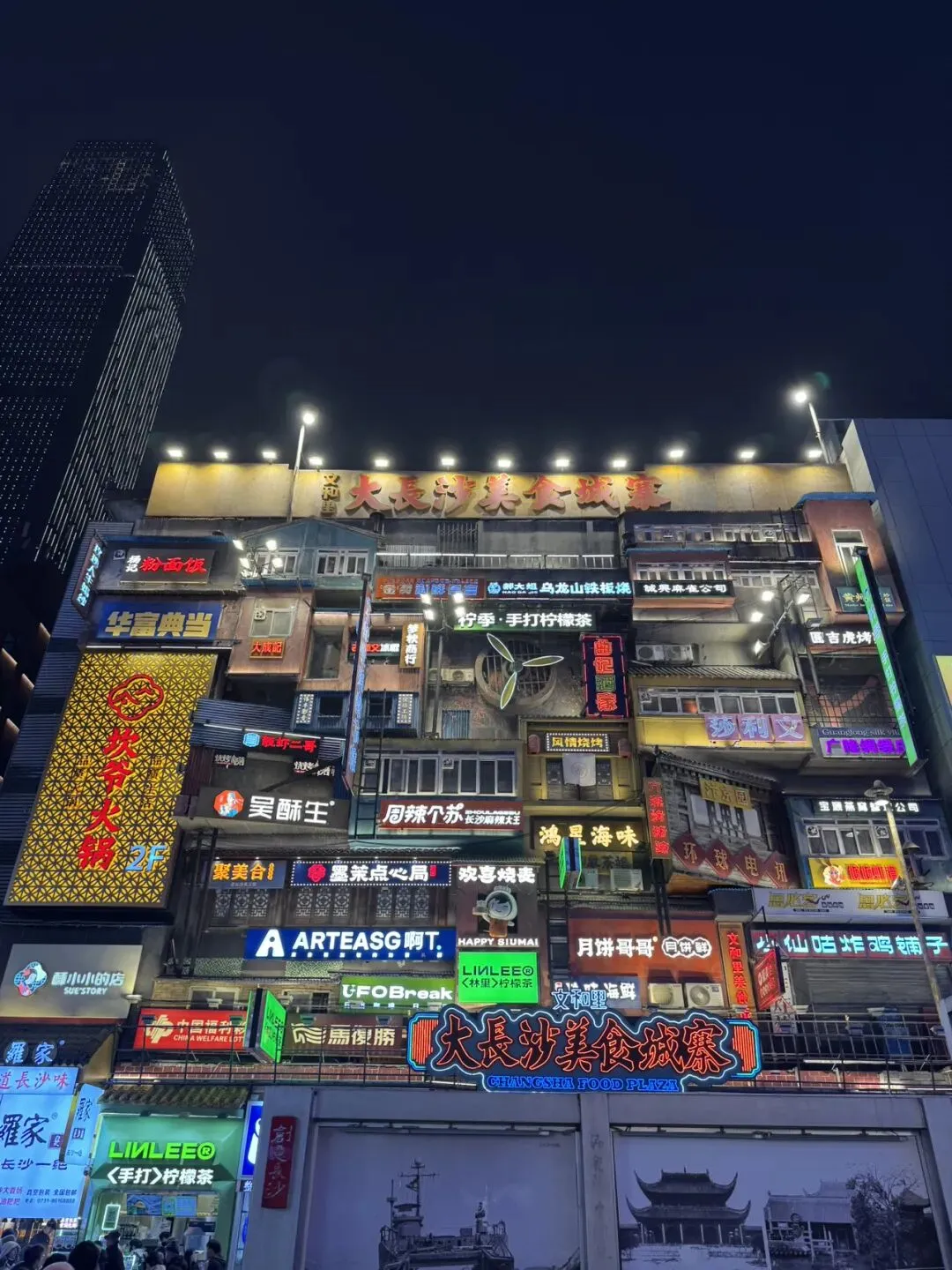 它最主要的特色就是在商场里面复刻80年代老长沙街景(握手楼、搪瓷杯、老招牌),6层楼高、汇集臭豆腐、小龙虾、糖油粑粑、卤猪脚等经典小吃,还有文创店等。