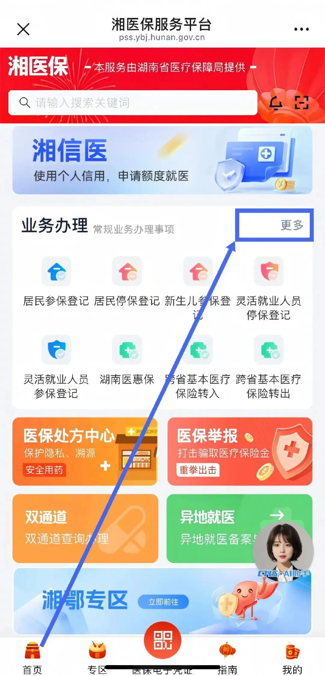 第一步:登录“湘医保”APP或小程序,进入“湘医保服务平台”首页;