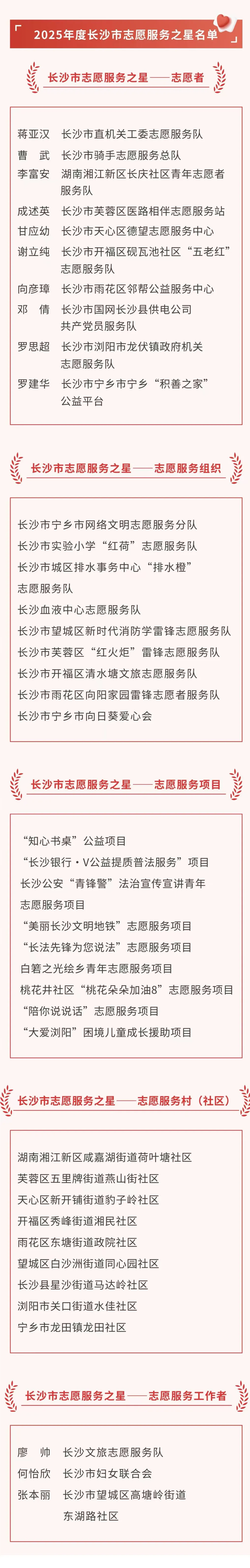 此次是长沙首次开展“志愿服务之星”评选,经过各地各部门推荐、资料审核、专家初评等环节,最终确定40个先进典型上榜。这些获奖对象遍布各行各业,既有扎根社区、默默奉献的基层志愿者,也有深耕专业领域、精准服务的行业队伍,还有聚焦乡村振兴、困境儿童援助、公益普法等领域的优质项目,更有将志愿服务深度融入基层治理的村(社区)等,他们用平凡善举诠释新时代雷锋精神,成为星城最动人的“志愿红”。