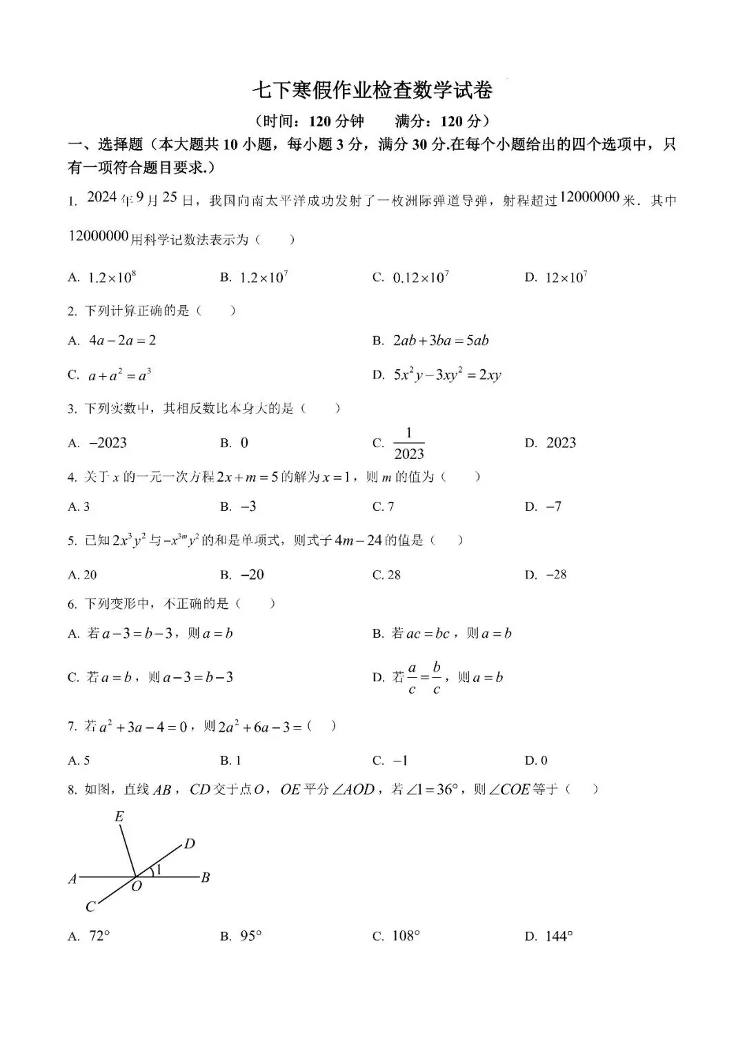 【真题汇总】——2024年长沙八年级下册入学检测数学试卷+参考答案(免费领取)