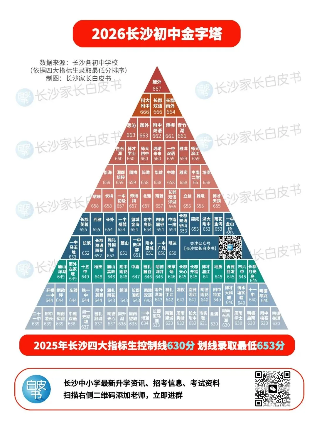 1、金字塔图参考自2025年长沙四大指标生最低分数据,排序而成,整体排序最高的学校是麓山外国语,科大附中、长郡双语、长郡雨外紧随其后;