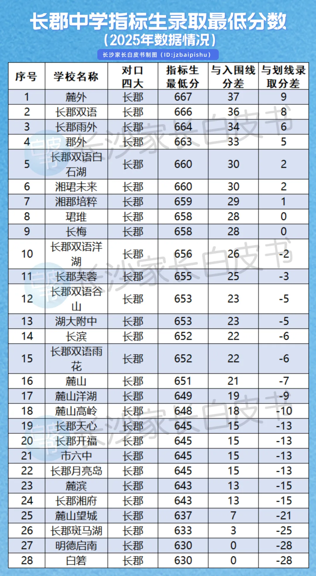 2、长郡中学指标生最低分排序第一的是麓山外国语667分,比划线录取线分高9分,有19所学校可以降分进长郡,最高可以降28分;