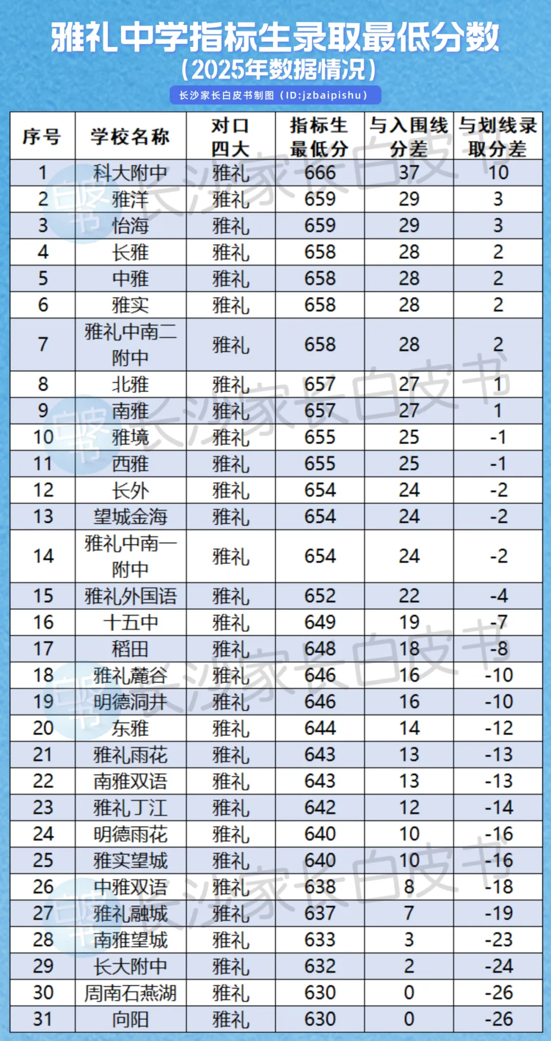 3、雅礼中学指标生最低分排第一的是科大附中666分,比划线录取线分高10分,有22所学校可以降分进雅礼,最高可降26分;