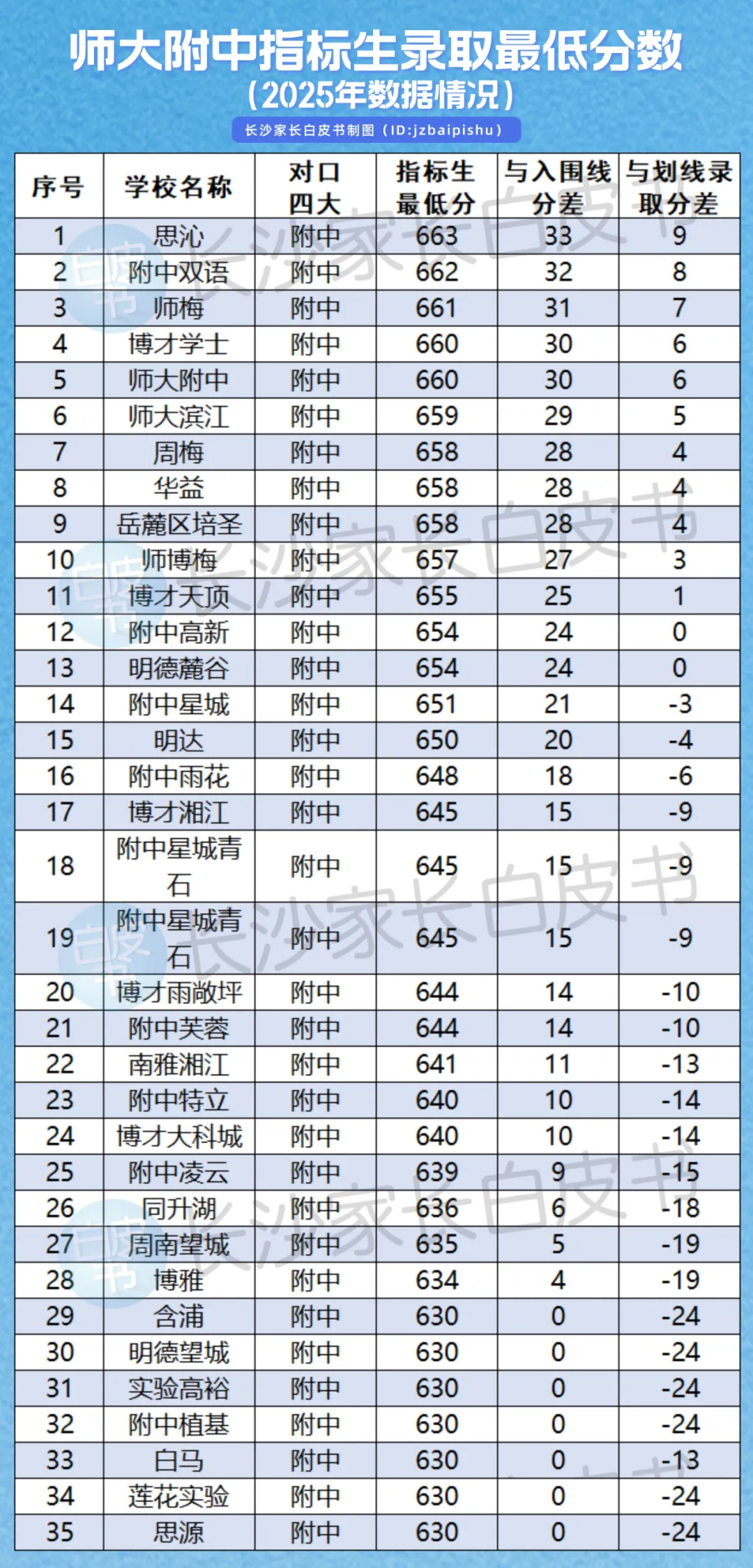 4、师大附中指标生最低分排第一的是思沁学校663分,比划线录取线分高9分,有22所学校可以降分进附中,最高降24分;