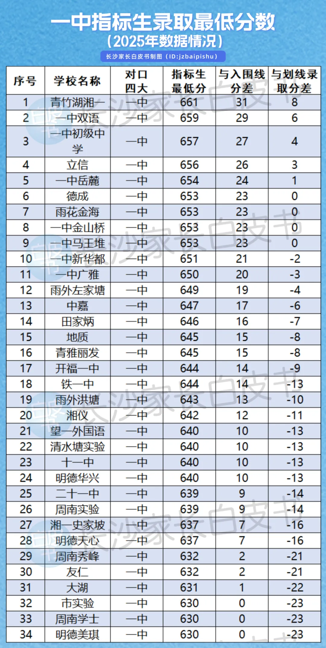 5、一中指标生最低分排第一的是青竹湖湘一661分,比划线录取线分高8分,有25所学校可以降分进一中,最高降23分。