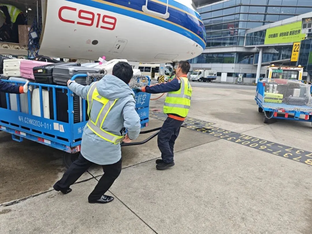 【图说】C919飞机旁,管理团队与员工合力推动装满行李的斗车。大家放弃休息、连轴转场,用脚步丈量流程,用汗水守住效率,只为旅客安心出行、航班顺利起飞。