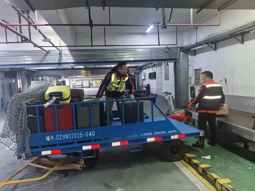【图说】分拣大厅内,管理团队成员与员工并肩作战,熟练地将行李从传送带上卸下,装进编号为“CZHNS2025-040”的斗车,装满的不仅是旅客的行囊,更是团队的坚守与责任。