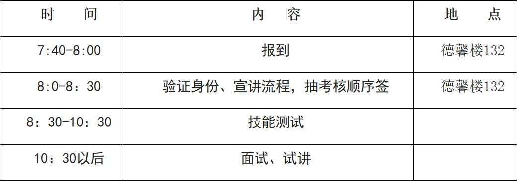 7.考生的面试、试教、技能测试成绩通知单在其后两个考生结束后领取(技能测试同时进行的,技能测试成绩于当天在学校官网公布)。