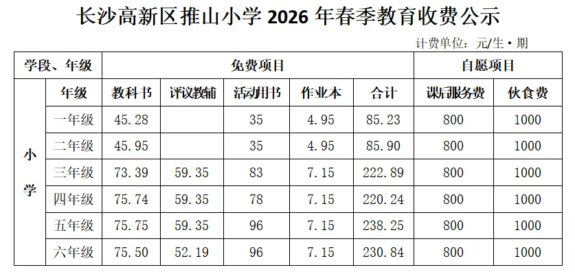 七、收费依据:《湖南省发展和改革委员会 湖南省新闻出版局 湖南省教育厅湖南省市场监督管理局关于印发湖南省中小学教材价格管理办法的通知》(湘发改价费规〔2022〕307号)、《湖南省发展和改革委员会 湖南省财政厅 湖南省教育厅 湖南省市场监督管理局关于进一步明确我省中小学教育收费政策的通知》(湘发改价费规〔2022〕643号)、《湖南省发展和改革委员会 湖南省教育 湖南省市场监督管理局关于印发湖南省民办中小学收费管理办法的通知》(湘发改价费规〔2024〕307号)、《湖南省发展和改革委员会 湖南省新闻出版局 湖南省教育厅关于核定湖南省中小学教辅材料价格的通知》(湘发改价费〔2025〕23号)、《湖南省发展和改革委员会 湖南省新闻出版局关于核定湖南省2026年春季中小学教科书价格的通知》(湘发改价费〔2026〕75号)、《长沙市发展和改革委员会 长沙市财政局 长沙市教育局 长沙市市场监督管理局 长沙市新闻出版局关于印发长沙市2026年春季中小学收费标准的通知》(长发改价费【2026】15号)等文件精神,义务教育校内课后服务收费严格按《长沙市教育局 长沙市发展和改革委员会 长沙市财政局 长沙市人力资源和社会保障局 长沙市市场监督管理局关于印发长沙市义务教育课后服务工作实施办法的通知》(长教发【2024】18号)执行。
