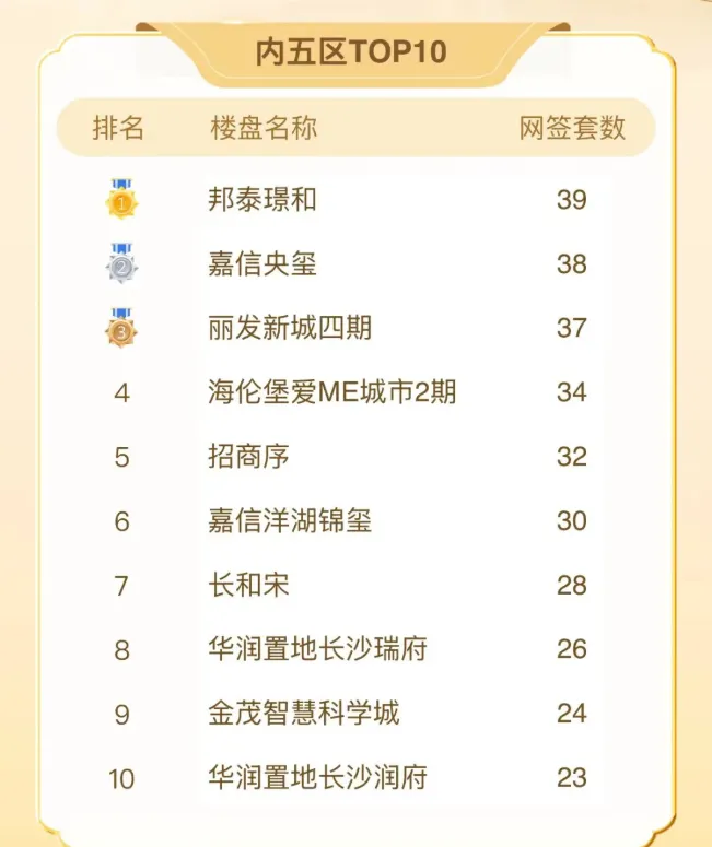 内五区TOP10楼盘中,邦泰璟和以39套网签量登顶,嘉信央玺(38套)、丽发新城四期(37套)分列二三位。TOP10楼盘网签套数区间为23-39套,热门楼盘对区域去化起到关键支撑作用。