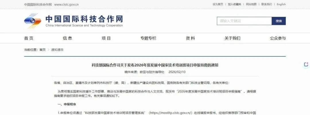 科技部国际合作司关于发布2026年度发展中国家技术培训班项目申报指南的通知