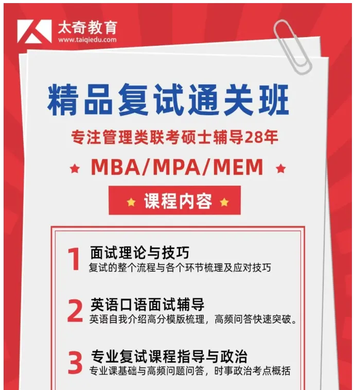 还有4周时间准备复试,昨天发了湖大和中南的,今天来看看师大和长理去年复试安排吧。注意:2026年湖南师大MBA非全扩招到95人,增加30个指标。全日制只招10人,减少20人,非全日制按照去年录取情况,过国家线认真准备复试一般不会淘汰,全日制竞争会比较激烈,一定要好好准备,如果复试被刷下来,还可以在调剂。注意:复试分为笔试+面试2个环节,和湖大、中南一样,都是考政治+管理学。面试部分:英语自我介绍,英语问答,综合面试这几部分。注意:3月底进行复试,湖南师范大学MBA只要一天时间可以进行完复试工作。MBA非全日制一般都会有调剂指标,全日制肯定是没有的。备考全日制的考生一定要好好准备复试,非全日制考生只需要正常准备即可。注意:2026年长理MBA非全招生简章招111人,增加了一些指标。复试都是按国家线来。注意:复试时间也在3月底进行,复试分为笔试+面试2个部分。温馨提醒:湖南师范大学和长沙理工大学MBA复试分数线都是参考国家线,一志愿参加非全复试基本上很少有淘汰,复试正常准备即可,但师大MBA全日制竞争会很大,会有一批淘汰下来的,被刷掉考生还是可以调剂到非全,这个不用担心。太奇复试班课程即将开班,调剂录取班火热招生中,想要一次上岸的考生,欢迎大家咨询我们太奇老师们~请多多关注长沙太奇教育哦~