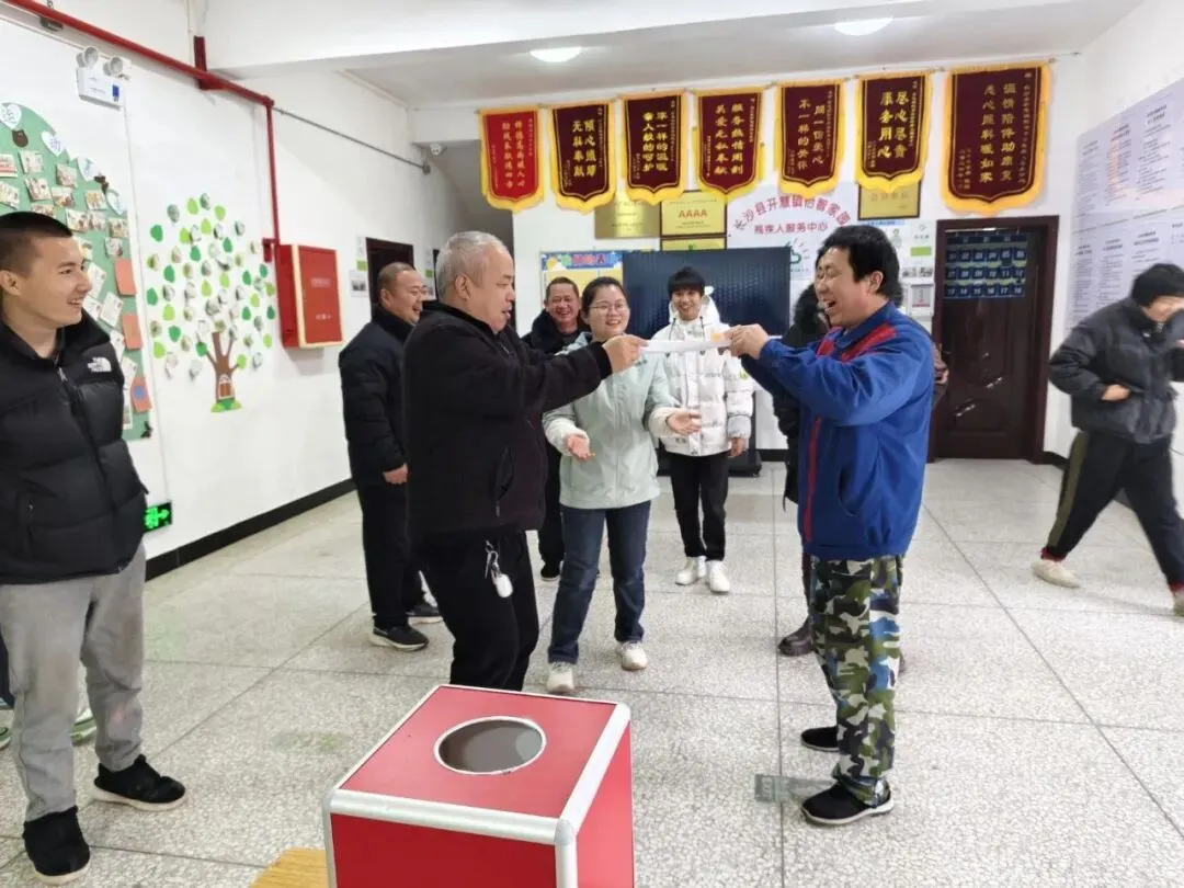 最令人期待的,莫过于趣味十足的“汤圆接力搬运” 小游戏。在开慧镇社工站张老师和托养机构老师们的加油鼓劲下,服务对象们两人一组、默契配合,用一张A4 纸共同托举乒乓球,小心翼翼地向目标容器前进。中途乒乓球掉落,大家便笑着重新出发,不气馁、不放弃;成功将球平稳放入容器时,现场便响起阵阵掌声与欢呼声。整个大厅里,欢声笑语此起彼伏,热闹非凡。游戏结束后,进球最多的小组收获了可爱的笑脸奖励,每一位参与者都在互动中体验到了合作的快乐与成功的喜悦。