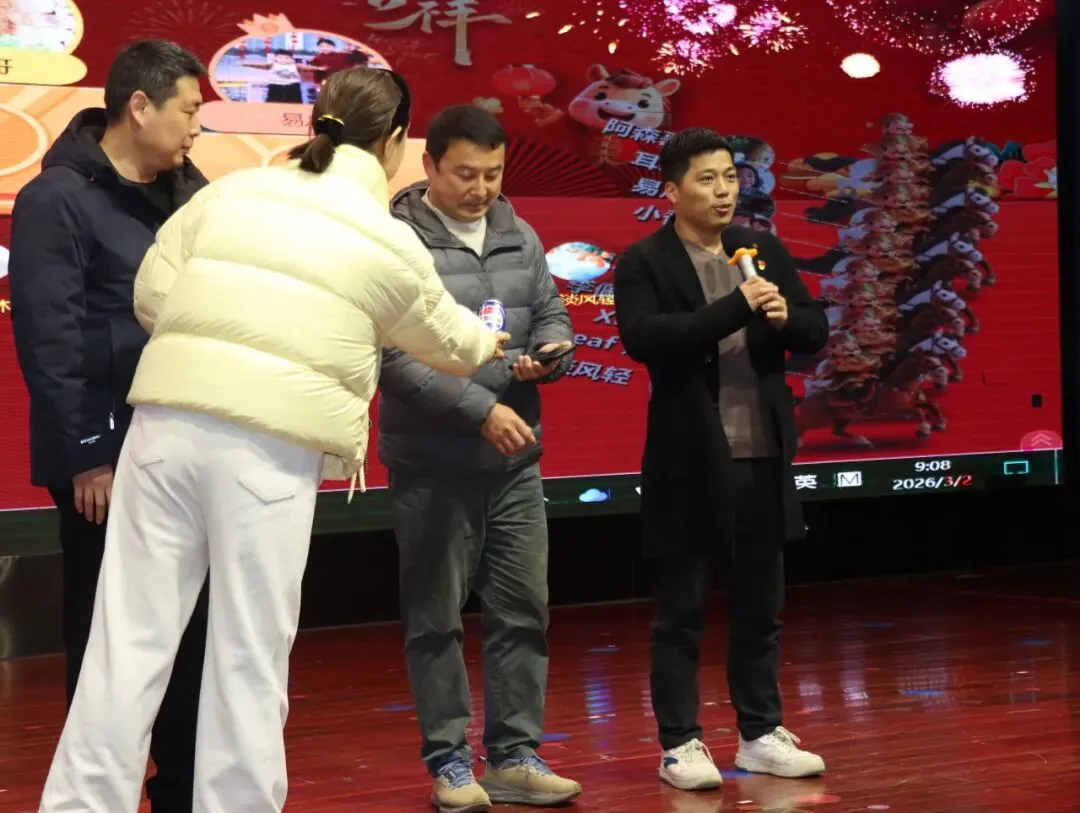 随后进行的“马上有福”击鼓传花环节,一绸大红花在欢声笑语中传递。被选中的老师伴着轻快音乐上台展示,活力满满的互动一扫假期慵懒,为整场会议营造出热烈温馨的氛围。