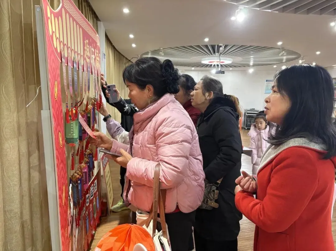 活动现场布置温馨喜庆,五彩斑斓的灯谜条悬挂其间,节日氛围浓厚。作为经典环节,“猜灯谜” 备受居民喜爱。灯谜内容丰富多元,涵盖传统字谜、成语谜,同时融入优生优育、健康养生、计生政策等科普知识,兼具娱乐性与教育性。